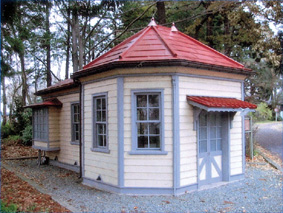 | 門番所は、明治36年盛岡高等農林学校の正門(現在の通用門)に建てられた「寄せ棟風八角」の造りで、建築文化にとって価値ある明治の建物です。この門番所は、本館竣工により、現在地に移築されました。この門番所と旧正門(土塁の一部を含む)も同時期の学校施設として価値が認められ、重要文化財に指定されました。 | ![]() 門番所 |